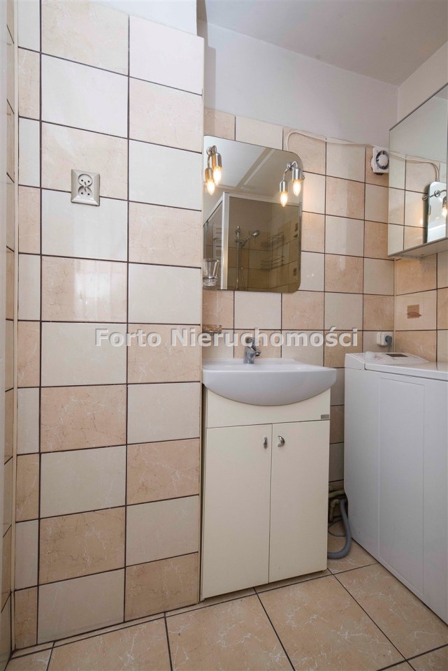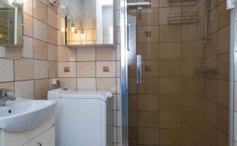 W kuchni pozostają meble i sprzęty AGD, w łazience znajduje się kabina prysznicowa.