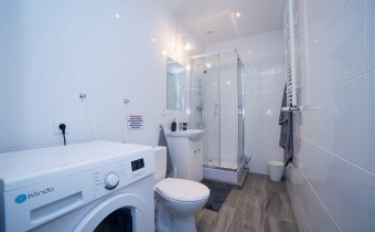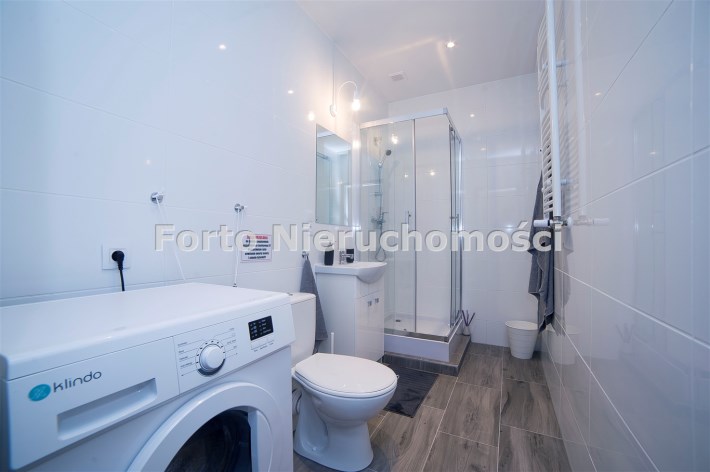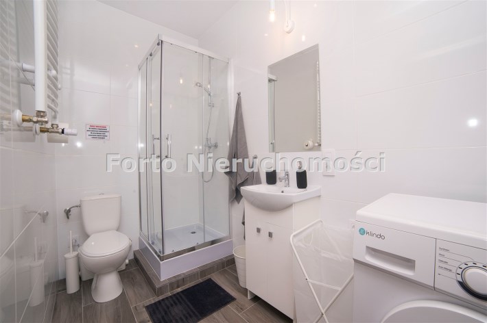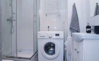Łazienka: wykończenie w jasnych kaflach, kabina prysznicowa, umywalka z szafką, ubikacja, pralka, podstawowe wyposażenia łazienkowe.