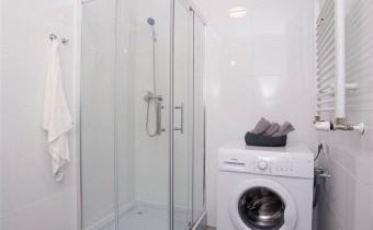 Łazienka: wykończenie w jasnych kaflach, kabina prysznicowa, umywalka z szafką, ubikacja, pralka, podstawowe wyposażenia łazienkowe.
