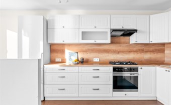 Kuchnia: Nowoczesna, w pełni wyposażona w sprzęt AGD, z białą zabudową.