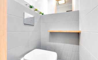 Łazienka i WC: Łazienka wykończona szarymi białymi kaflami, wyposażona w wannę. Dodatkowo, osobne WC również w szarych kaflach.