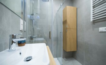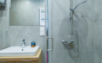 ✔️ Łazienka w jasnych kaflach z kabiną prysznicową