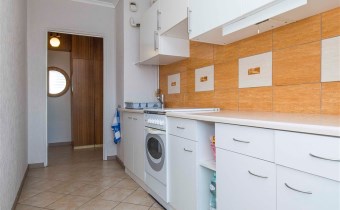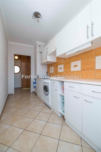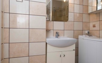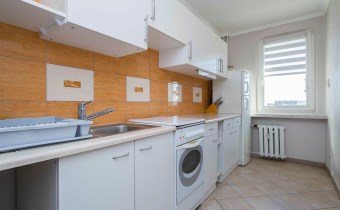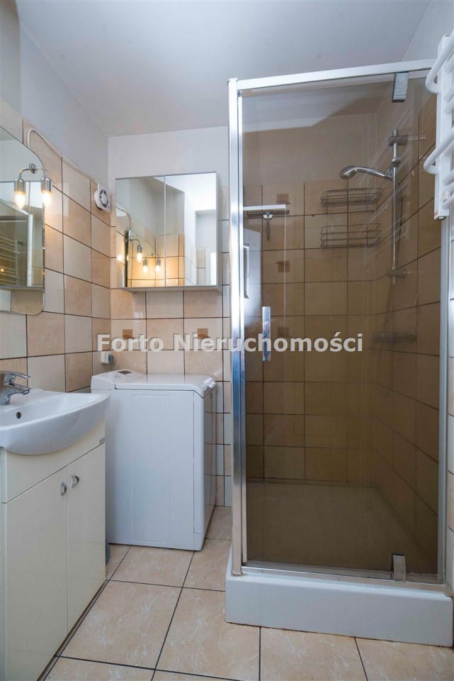 W kuchni pozostają meble i sprzęty AGD, w łazience znajduje się kabina prysznicowa.