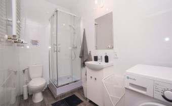 Łazienka: wykończenie w jasnych kaflach, kabina prysznicowa, umywalka z szafką, ubikacja, pralka, podstawowe wyposażenia łazienkowe.