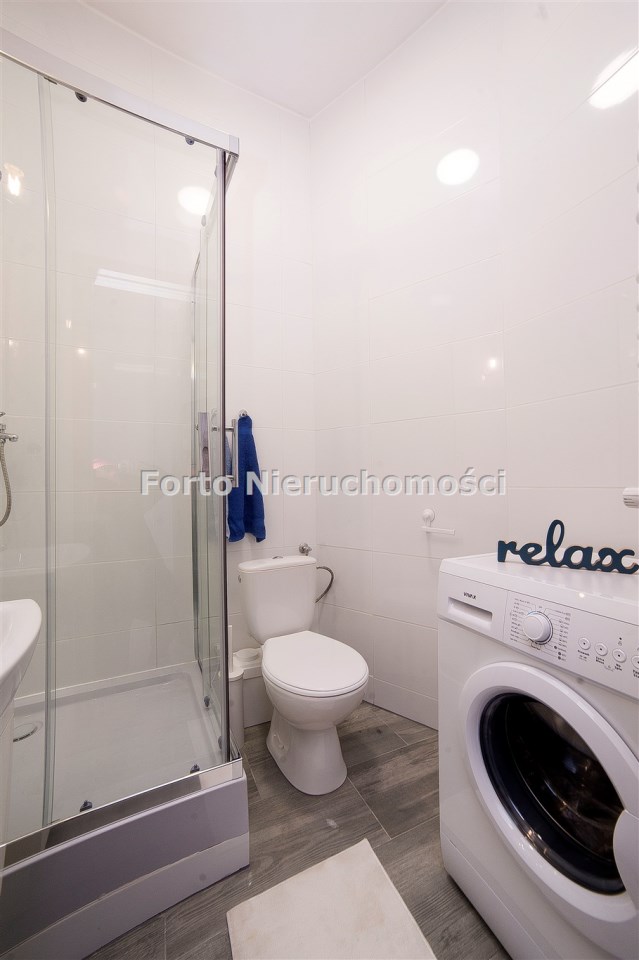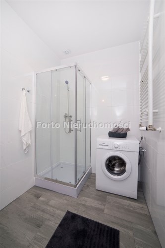 Łazienka: wykończenie w jasnych kaflach, kabina prysznicowa, umywalka z szafką, ubikacja, pralka, podstawowe wyposażenia łazienkowe.