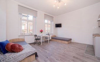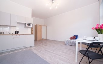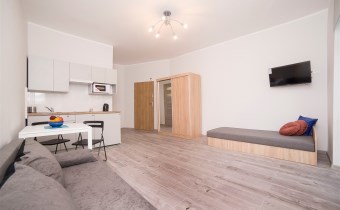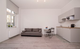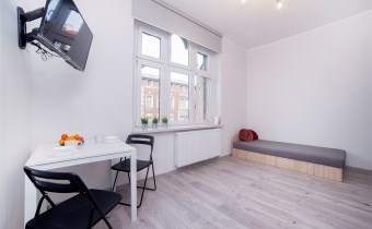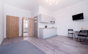 Każda z kawalerek składa się z pokoju, podzielonego na strefę dzienną oraz część jadalną, aneksu kuchennego oraz łazienki z wc. W jednym z mieszkań balkon.