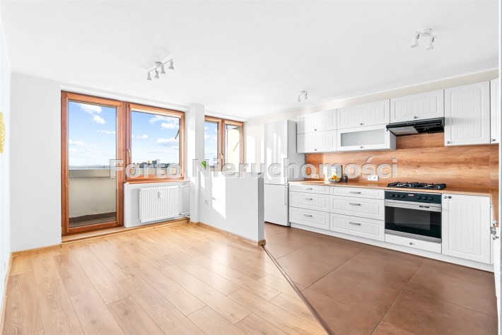 Kuchnia jest połączona z jadalnią, co stwarza przestronną i funkcjonalną przestrzeń. Z kuchni połączonej z jadalnią prowadzi jedno z wyjść na balkon.