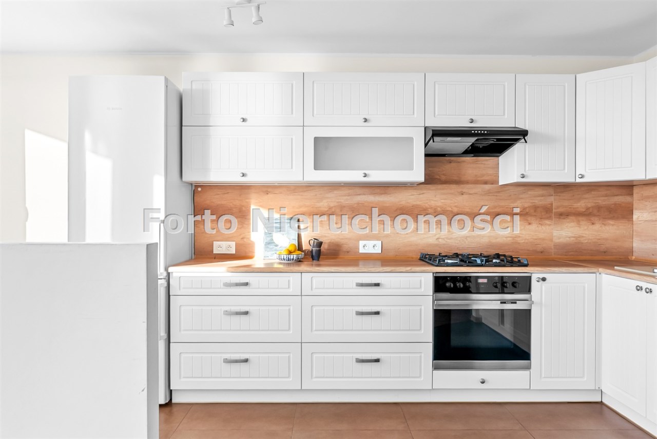 Kuchnia: Nowoczesna, w pełni wyposażona w sprzęt AGD, z białą zabudową.
