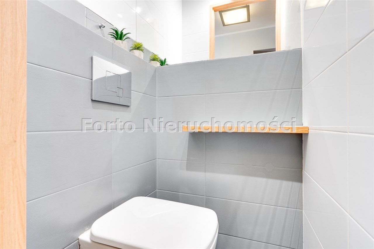 Łazienka i WC: Łazienka wykończona szarymi białymi kaflami, wyposażona w wannę. Dodatkowo, osobne WC również w szarych kaflach.