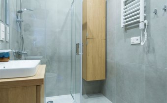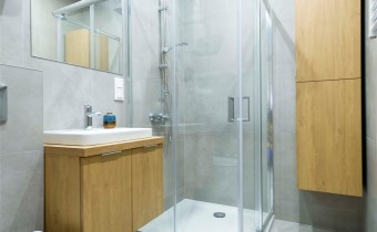 ✔️ Łazienka w jasnych kaflach z kabiną prysznicową